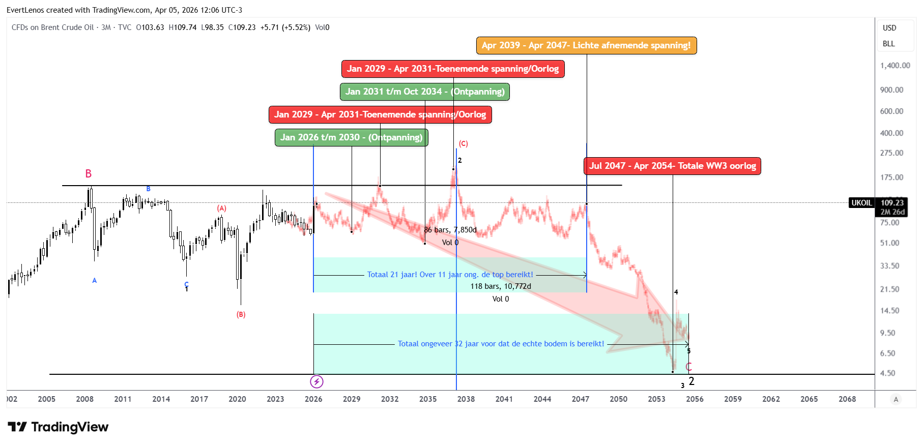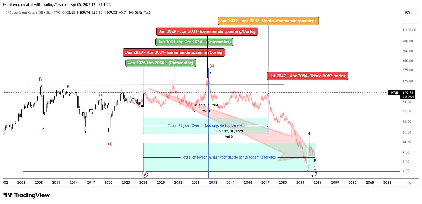 Het punt is: markten kunnen tijdelijk ver van hun werkelijke waarde afwijken, maar op langere termijn corrigeren ze naar fundamentele realiteit. Voor olie betekent dit dat, ondanks de huidige piek van 106 dollar per vat, de structurele waarde op termijn veel lager ligt — richting ongeveer 9,50 dollar per vat — gebaseerd op werkelijke vraag, aanbod en de energietransitie.